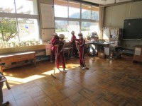 給食当番が、整然と給食を配っています。このメニューは、ご飯・牛乳・すまし汁・きのこのしのだ煮・きんぴらごぼう・アーモンドフィッシュです。