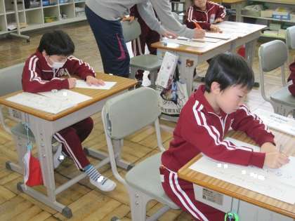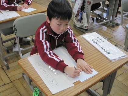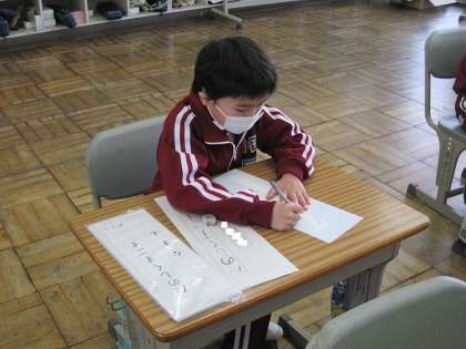 1・2年生は硬筆の部門で、書きぞめ展に出品します。冬休み前に、学級で課題の確認をしていました。1年生は、「たのしくすごす」と書きます。濃くしっかりとした文字で書くには集中力が必要です。がんばって!