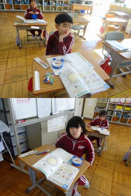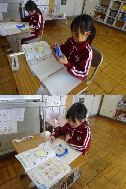 1年生の算数の時間です。今日は、「なんじなんぷん」の学習で、算数セットの時計を使って問題を解いていました。時計のめもりの1が5分を、2が10分を表すことなど、時計の基本的な読み方を学習しました。これからの学校生活で、繰り返し練習をしていきます。