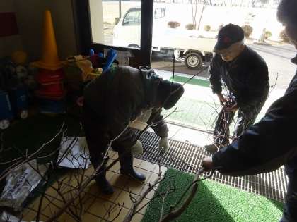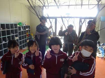 明日のだんごさしに向けて、千寿会の方がミズキの木を昇降口に設置してくださりました。準備中に通りかかった1年生が千寿会の方とミズキの木の前で写真を撮りました。いつも本当にお世話になっています。