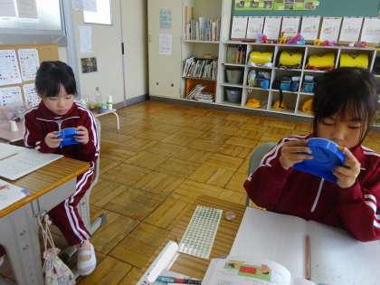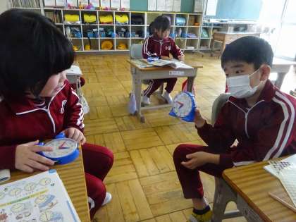 1年生が算数の時間に問題の出し合いをしていました。算数セットの時計を使って、「これは何時何分でしょう?」と繰り返し時計の読み方を練習していました。お家でも練習できるといいですね。