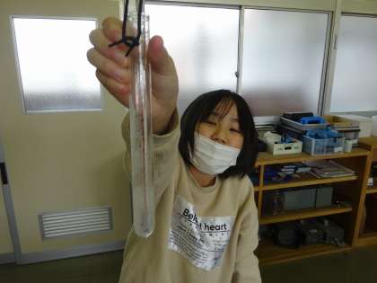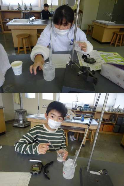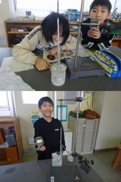 4年生の理科「水のすがたと温度」の学習です。氷の入ったビーカーに食塩水を入れて冷やし、その中に入れた試験管内の水の温度や水の様子を調べました。4名の子どもたち全員の試験管内の水が氷になり、その実験結果から規則性を導き出すことができました。