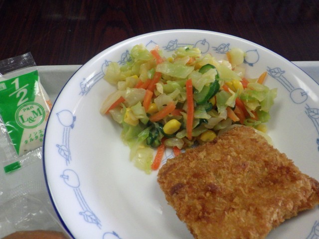 白身魚カツにタルタルソースをかけ、ロールパンにはさんでガブッといただきました。サクサク衣と魚の柔らかい食感がパンによく合いおいしかったです。キャベツとコーンのサラダと、ABCマカロニスープとともにいただきました。今週もごちそうさまでした。