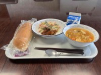メニューは、黒パン ワンタンスープ 肉だんご 春雨サラダ 牛乳。