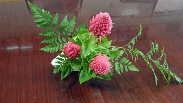 華道・茶道部の皆さんから、素敵なお花をいただきました。鶏のトサカ(鶏頭)に似た赤い花と、革(レザー)のように光沢のある緑色の葉の調和が見事ですね。
