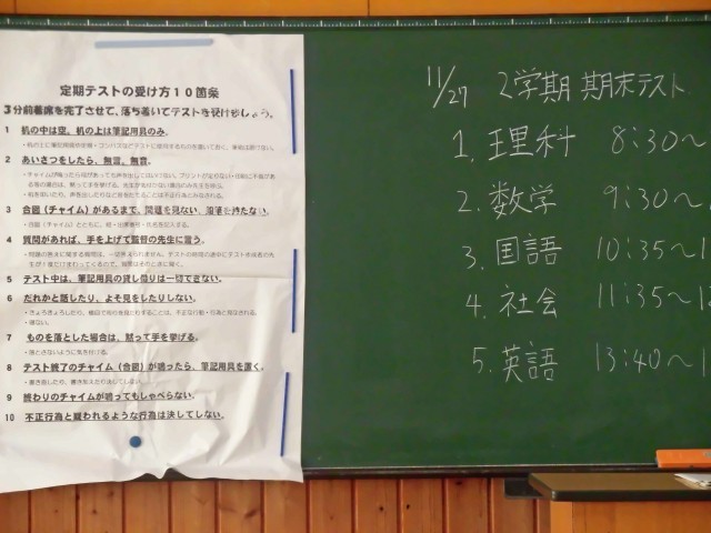 1、2年生は期末テストに臨んでいます。これまでの勉強の成果が十分発揮されることを期待します。さらに、1、2年生は、12月に伊達市学力調査が、3年生は実力テストがあります。気を緩めず、継続して学習に励みましょう。