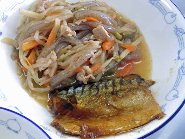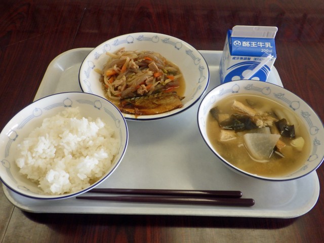 さばのみそ煮ならぬカレー煮。ありです! カレーの風味で魚の味がより奥深くなりごはんが進みました。さつまいもや油揚げ、大根などがゴロゴロ入ったお汁や、しっかりとした味付けのもやしとこんにゃくの炒め物で最後の米粒1つまで完食です。ごちそうさまでした。