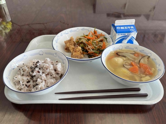 味付けがしっかりしているジューシーから揚げと、郷土料理献立で、まめっこ汁といか人参をいただきました。