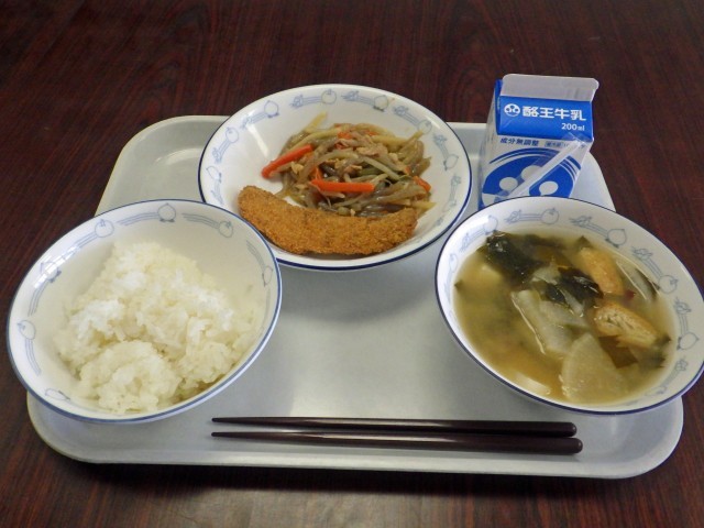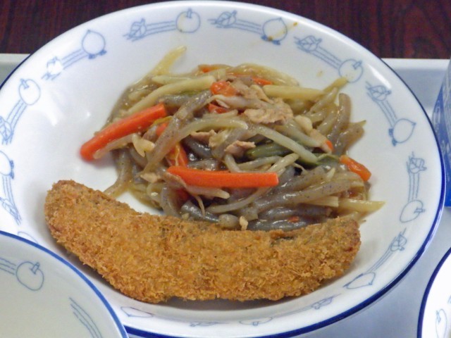 今日は節分こんだてです。いわし味付きフライは衣がカリッとしていて全く臭みもなく、骨までおいしくいただきました。さつまいもの甘みが染み出たみそ汁と、もやしとこんにゃくの炒め物もごはんによく合いました。ごちそうさまでした。