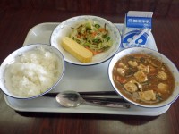 メニューは、あっさりカレー風味うどん あべかわもち 野菜の卵チーズ和え 牛乳。