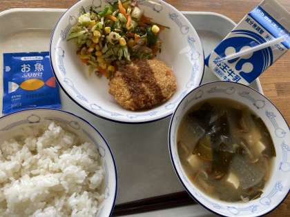 本日のメニューは、ごはん/なめこ汁/ふりかけ/福島キャベツメンチカツ/りっちゃんサラダ/牛乳。