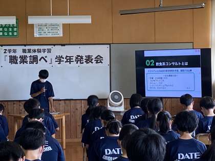 午後から2年生は、各学級の代表2名による学年発表会を行いました。それぞれが調べた、声優、調理師、馬育成、介護福祉士、医師、飲食店コンサルタントについて、タブレットを使ってまとめたものを大型テレビに映しながら、学年全体の前で発表しました。どの発表も、各職種の特徴をわかりやすく説明でき、聞く側の生徒も真剣そのものでした。