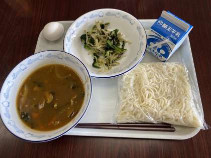本日のメニューは、カレーうどん/味付け卵/野菜ののり和え/牛乳。