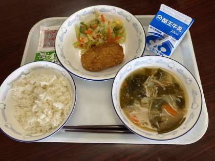 本日のメニューは、麦ごはん/ふりかけ/吉野汁/とんかつ/キャベツのサラダ/牛乳。