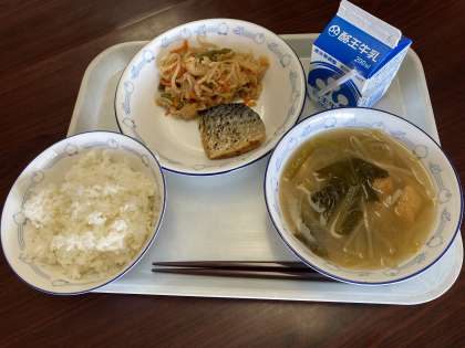本日のメニューは、カルシウムごはん/もやしのみそ汁/さばのハーブ焼き/切干し大根の煮物/牛乳。