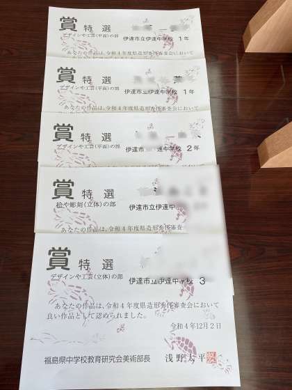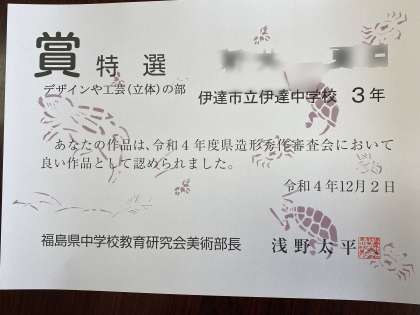 生徒のすばらしい美術の作品(デザイン工芸の部 平面 立体)が特選に選ばれました。また、多くの生徒も入選しました。