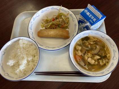 本日のメニューは、カルシウムごはん/にら卵汁/春巻き/野菜炒め/牛乳。