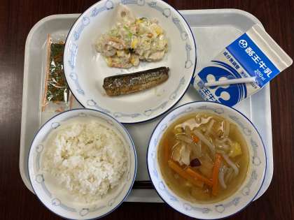 本日のメニューは、麦ごはん/味付けのり/さつまけんちん汁/いわしのしょうが煮/れんこんサラダ/牛乳。