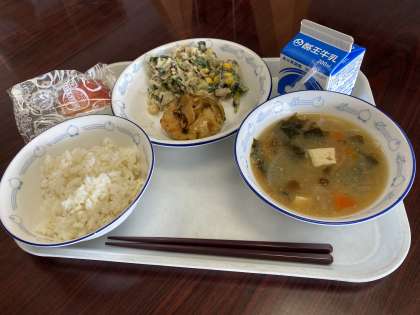 本日のメニューは、麦ごはん/なめこ汁/豆腐ハンバーグのあんかけ/ひじきのマヨネーズサラダ/りんご/牛乳。