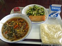 本日のメニューは、すき焼き風うどん/栗入りコロッケ/ツナおかか和え/牛乳。