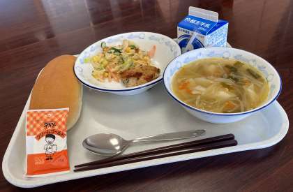 本日のメニューは、コッペパン/ワンタンスープ/とり肉のハーブ焼き/キャベツとオーロラサラダ/クリームゴールド/牛乳。