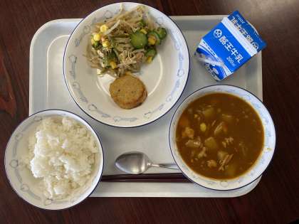 給食メニューは、枝豆入りポークカレーライス 鶏つくね 茎わかめのサラダ 牛乳