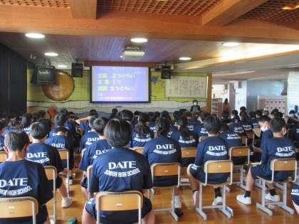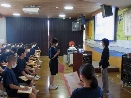 作り方のポイント「お(弁当箱の大きさ)・い(彩り)・し(主食や主菜の割合)・そ(それぞれの味付け)・う(動かないように詰める)」を知り、代表生徒が9月4日に行われる弁当の日に向けた抱負を発表していました。