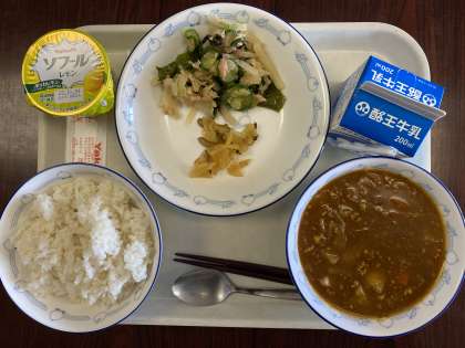 メニューは、ひき肉と大豆のカレーライス 福神漬け 大根サラダ レモンヨーグルト 牛乳。