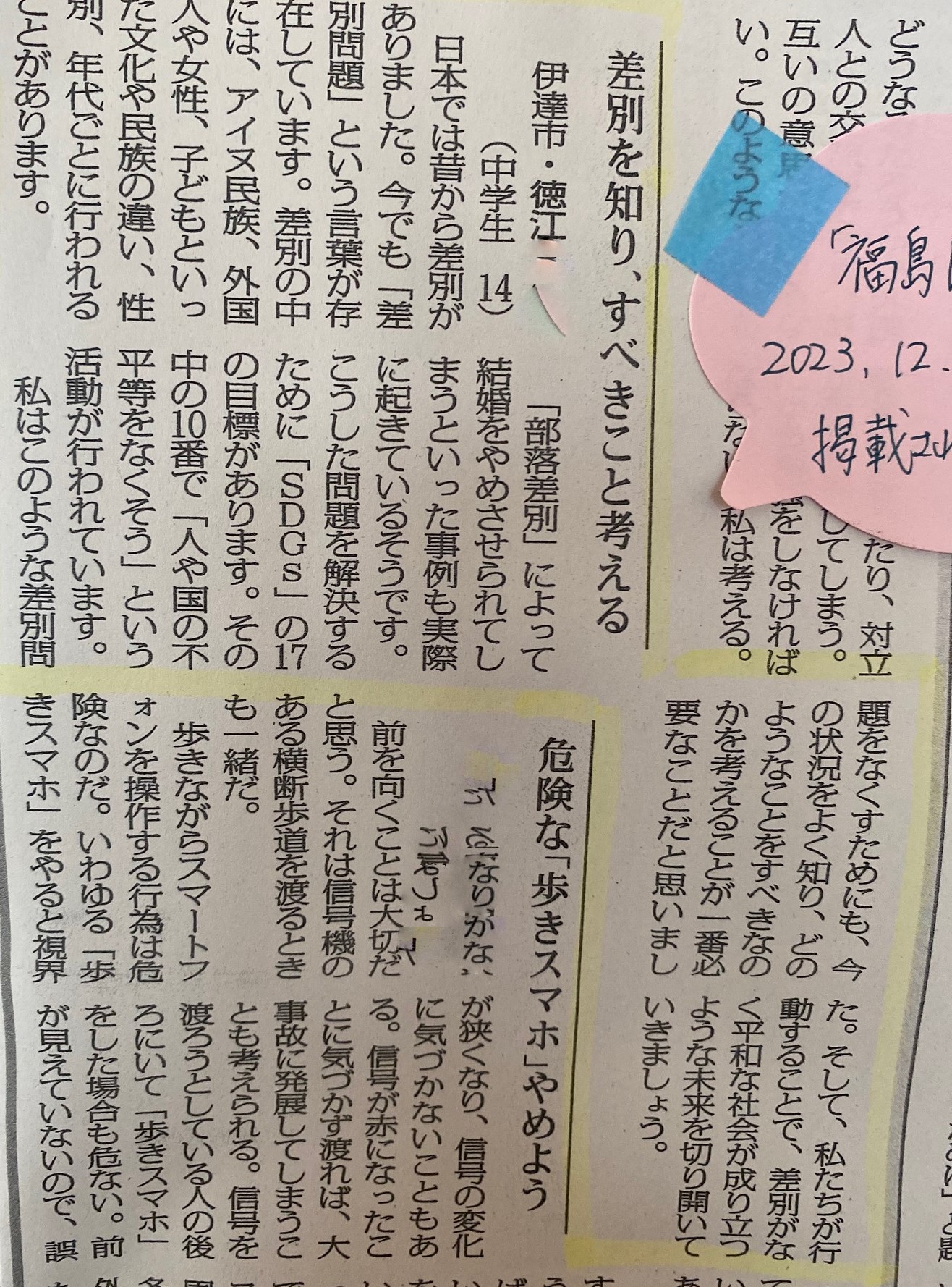 昨年、3年生が新聞に投稿した文章です。