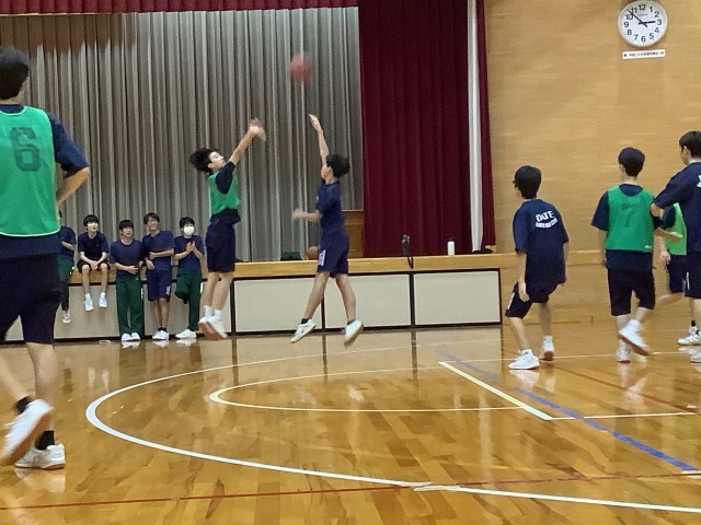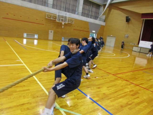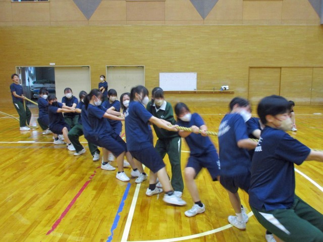 学級、そして、学年の団結力を高めるために学年レクが行われました。しっかりと準備体操を行ってからバスケと綱引きが行われました。