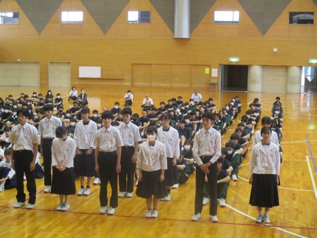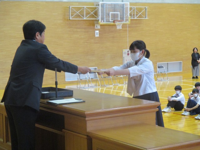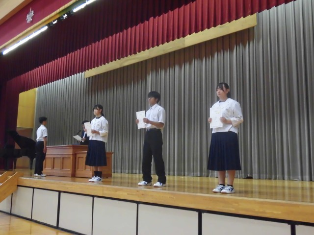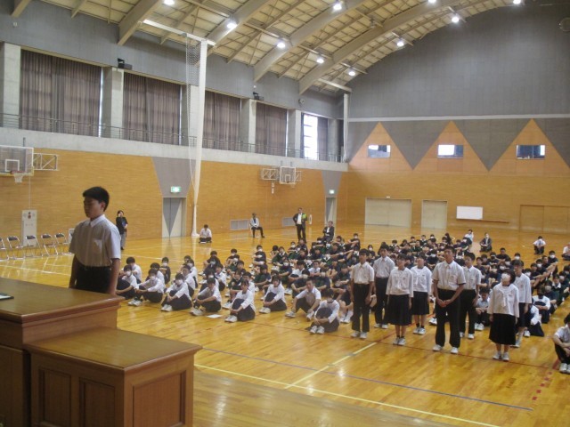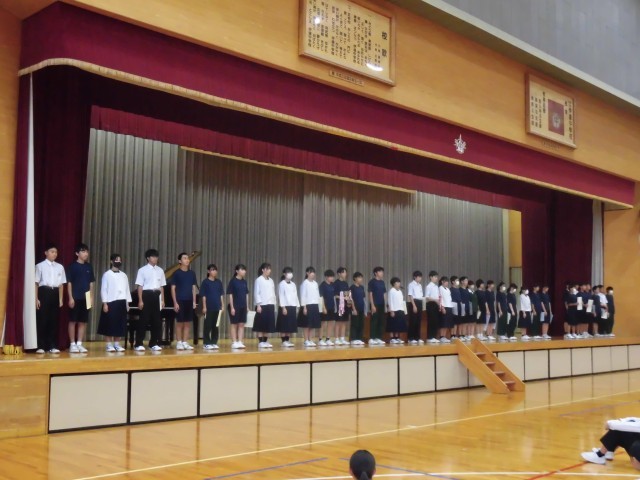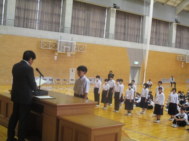 後期の生徒会役員、学級役員、各専門委員会役員の任命式が行われました。素晴らしい返事と態度にリーダーとしての自覚が感じられました