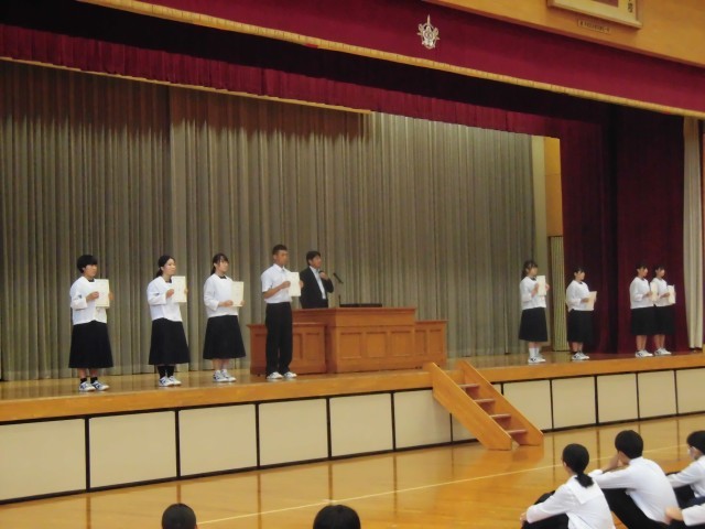 夏休み中から現在までの各種大会、コンクールの表彰披露が行われました。幅広い分野でたくさんの生徒の活躍が光りました。ステージ上も横1列でギリギリ並ぶことができました。今後のさらなる飛躍を期待します。