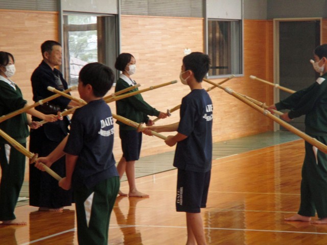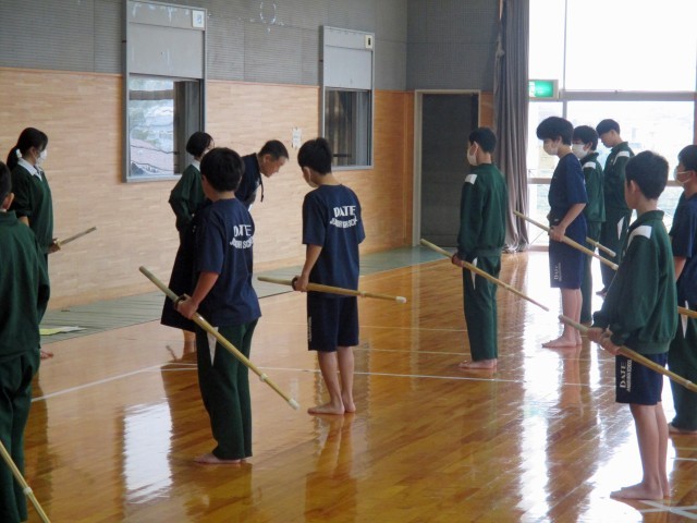 剣道の授業が始まりました。講師の先生にお出でいただき、あいさつや構えなど基本的なことから教えていただきました。