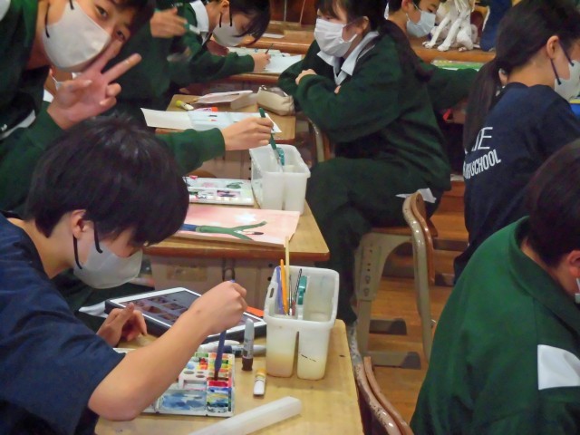 3年英語の授業では、自分のお気に入りのもをタブレットで示しながら説明しています。友達の発表に興味津々です。