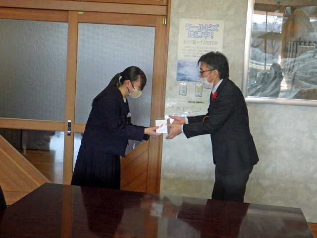 赤い羽根共同募金で集まったお金を社会福祉協議会の方にお渡ししました。一人一人の善意が社会のために役立つことをうれしく、そして、誇りに思います。