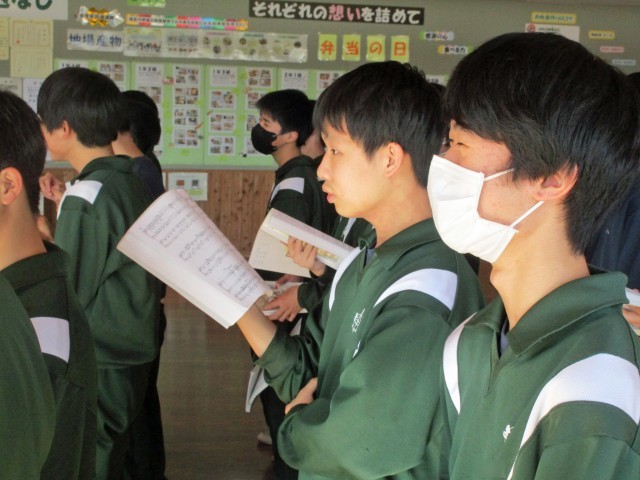 3学年では、県立入試の面接練習が始まりました。自分のことを相手に言葉でしっかり伝えてほしいと思います。1、2年生も、質問されたら「はい」と返事をしてから自分の考えを伝えられるように、普段の生活や授業の中で意識していきましょう。