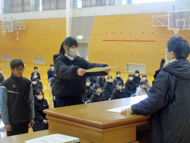3学年で学年集会が行われ、卒業式の意義と心構えについて学年の先生からお話がありました。話を真剣に聞く態度から、今後しっかりと練習し、当日素晴らしい式になる予感がしました。
