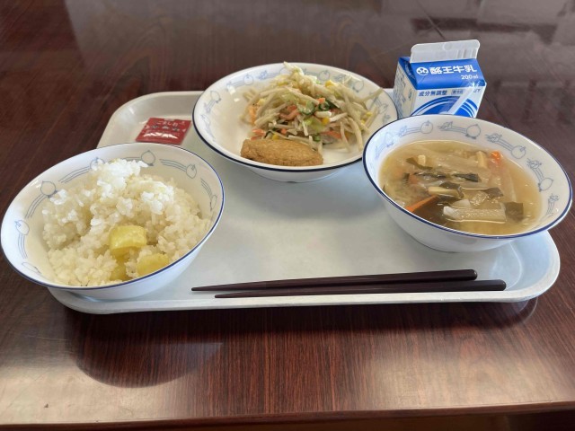 本日は、さつまいもごはん。さつまいもの甘みを味わいました。さらに、ごましおも付いて、食が進みます。きのこ入り信田煮やごぼうサラダ、引き菜汁と、野菜もたっぷりいただきました。本日も、大変ごちそうさまでした。