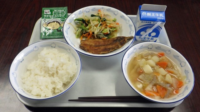 かば焼きは甘辛いしょうゆ味がしみていておいしかったです。カルシウム入りのごはんに、さらにふりかけをかけて栄養満点です。ほどよい辛さのからし和えと、その名の通り具だくさん汁でおなかいっぱいです。午後からの文化祭の準備頑張ります! ごちそうさまでした。