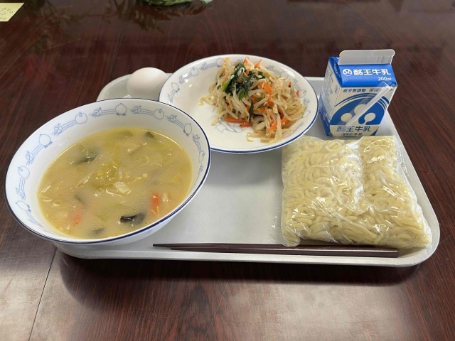 本日は、とんこつラーメン。お話献立という企画で、本に出てくる料理の登場です。今回は、「キミスイ」こと、「君の膵臓をたべたい」に出てくる博多ラーメンをイメージした一品です。ソフトめんを使った料理は数あれど、とんこつラーメンが食べられるのは、県内でも珍しいと思います。本日もごちそうさまでした。
