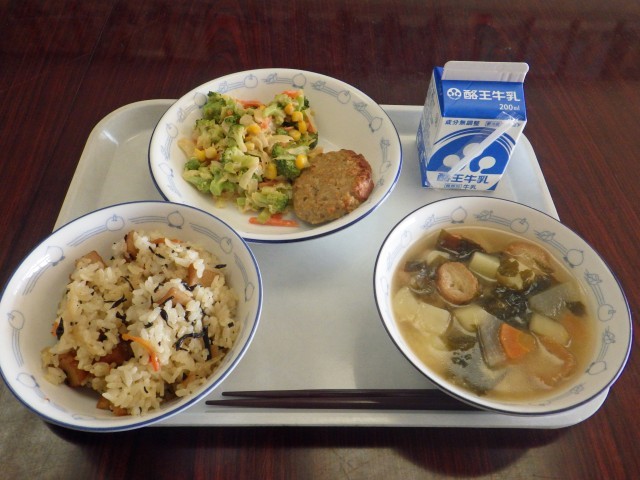 「どれから食べようかな?」と迷いましたが、やっぱり五目うどんからいただきました。体が温まりました。ひじきのマヨネーズサラダもしっかり味がしみていておいしかったです。さて、いよいよ揚げパンです。きな粉がたっぷりとっかっていて予想通りのおいしさでした。チーズまでついていて、もう食べ盛りの生徒(職員?)には至福の時間でした。 ごちそうさまでした!