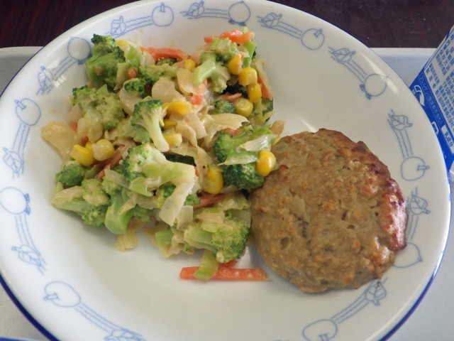 ハンバーグを半分に割ると中からとろーっとチーズ風のクリームがあふれてきました。洋風でとてもおいしかったです。シャキシャキのりっちゃんサラダと、こちらもとろっとしたなめこ汁で今日もおいしくいただきました。ごちそうさまでした。