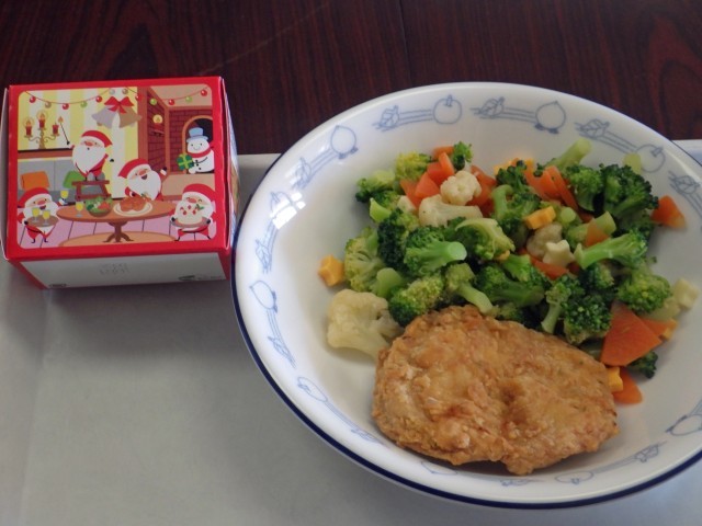 フライドチキンはしっかりとした味付けで衣の食感もよくとてもおいしかったです。星形チーズ入り野菜とコンソメスープと共にいただきました。ミニといいながら十分なボリュームのある黒パンとお待ちかねのクリスマスケーキでおなかいっぱい、気分はもうメリークリスマス! ごちそうさまでした。