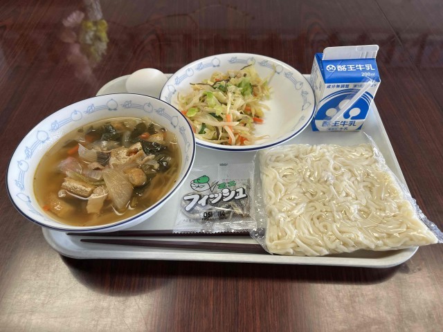 本日は、地場産物活用献立で福島肉うどんでした。シャキシャキのこんぶ和えの野菜と、味付き卵、そして味付き小魚で本日も食べ応えのあるメニューでした。たいへん、ごちそうさまでした。