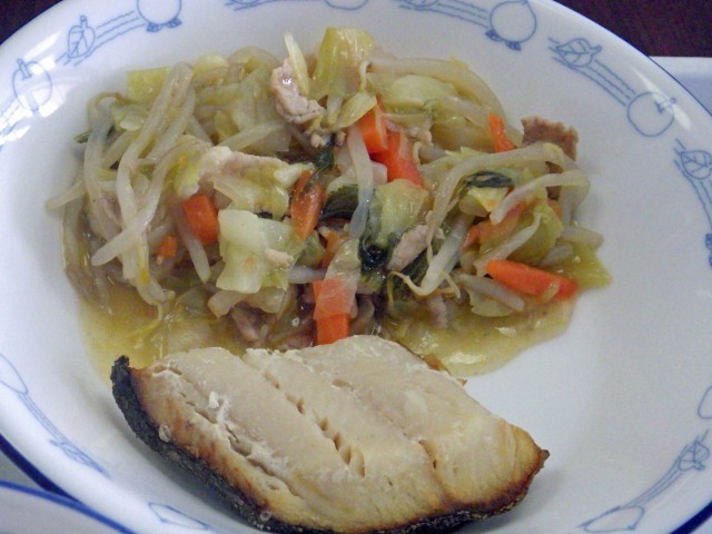 ほどよい塩加減のほっけと野菜炒めはごはんとの相性抜群でおいしくいただきました。えのき入りみそ汁は、油揚げやジャガイモがたくさん入っていて食べ応えがありました。最後にほろ苦テイストのカスタードプリンで、今日もごちそうさまでした。