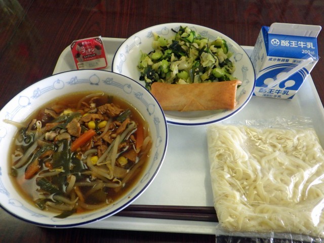 本日は、地場産物活用献立で福島肉うどんでした。シャキシャキのこんぶ和えの野菜と、味付き卵、そして味付き小魚で本日も食べ応えのあるメニューでした。たいへん、ごちそうさまでした。