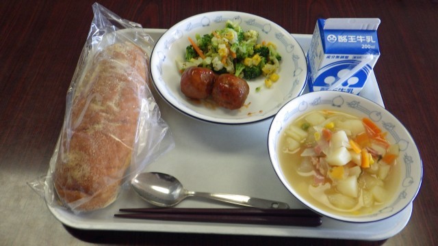 かば焼きは甘辛いしょうゆ味がしみていておいしかったです。カルシウム入りのごはんに、さらにふりかけをかけて栄養満点です。ほどよい辛さのからし和えと、その名の通り具だくさん汁でおなかいっぱいです。午後から...