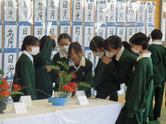 明日の桃花祭に向けて武道場や家庭科室の展示作品を学年ごとに鑑賞しています。保護者の皆様もぜひご覧ください。