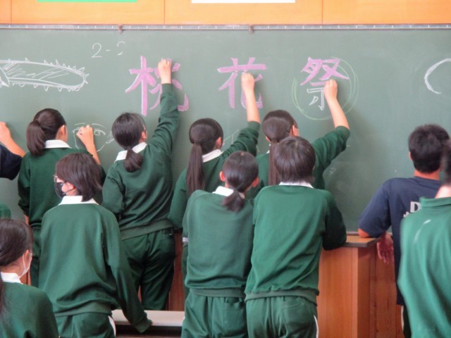 各学級では明日の桃花祭に向けて仕上げの練習をしたり、思いや願いを黒板アートに表現しています。それらが明日につながり、煌めきとなりますように!