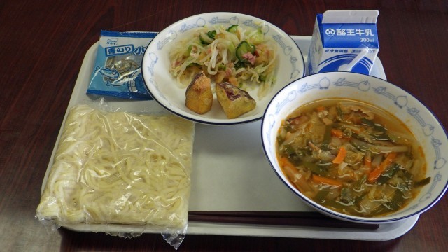 ピリ辛のキムチスープで体も温まり、おいしくいただきました。あべ川いもは、じっくりと揚げられていて甘みが一層感じられました。コリコリ感のあるくらげサラダと、かみ応えのある青のり小魚で、今日もごちそうさま...